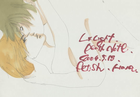 「L×月 FETISH」 サイトの再録1、ギャグとシリアス68p 「L×月 FETISH2」 サイトの再録2、ギャグとシリアス60p 「L×月 FETISH3」 書き下ろしとサイトの再録、ギャグとシリアス58p 「L×月 FETISH4」 書き下ろしとサイトの再録、ギャグとシリアス84p 「L×月 FETISH5」 書き下ろしとサイトの再録、ギャグとシリアス52p 「L×月 FETISH6」 書き下ろしとサイトの再録、ギャグとシリアス84p